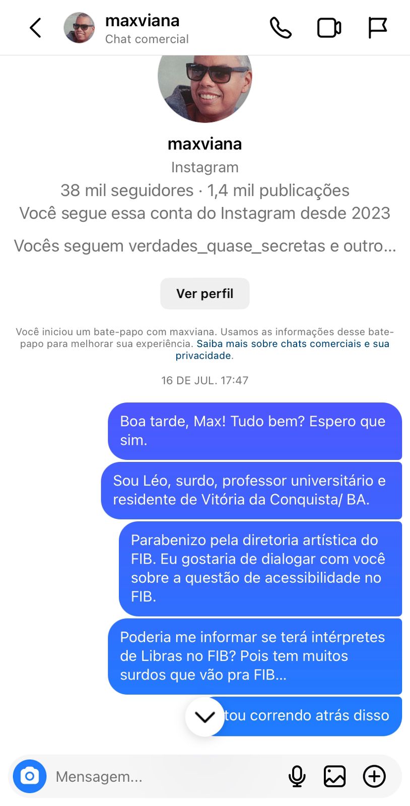 Em julho, o influencer tentou contato até com o diretor artístico do FIB, Max Viana, ainda via Instagram. Novamente sem resposta, falou com a assessoria de imprensa do evento, que passou a ele um número de telefone da Bahia Eventos. Mas apesar de ter sido iniciado um diálogo e negociação com a empresa para a inclusão de intérpretes de Libras nos shows, a contratação não foi efetivada.