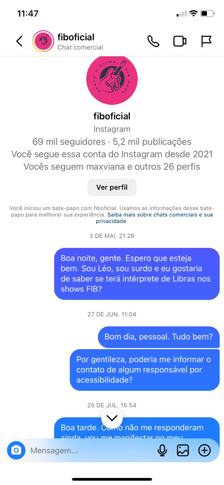 A primeira vez que ele questionou a produção do evento se haveria intérpretes de Libras nos shows foi em maio deste ano, por meio de mensagem enviada para o perfil oficial do Festival no Instagram. Ficou sem resposta. Em junho, cobrou novamente pela rede social um retorno da organização do evento a respeito do assunto, mas também não obteve nenhum retorno.