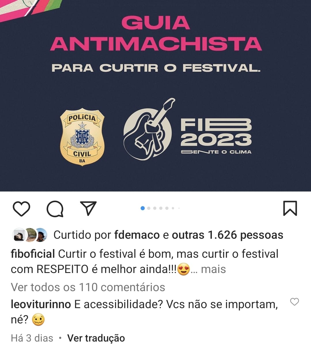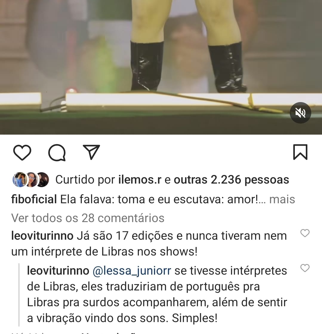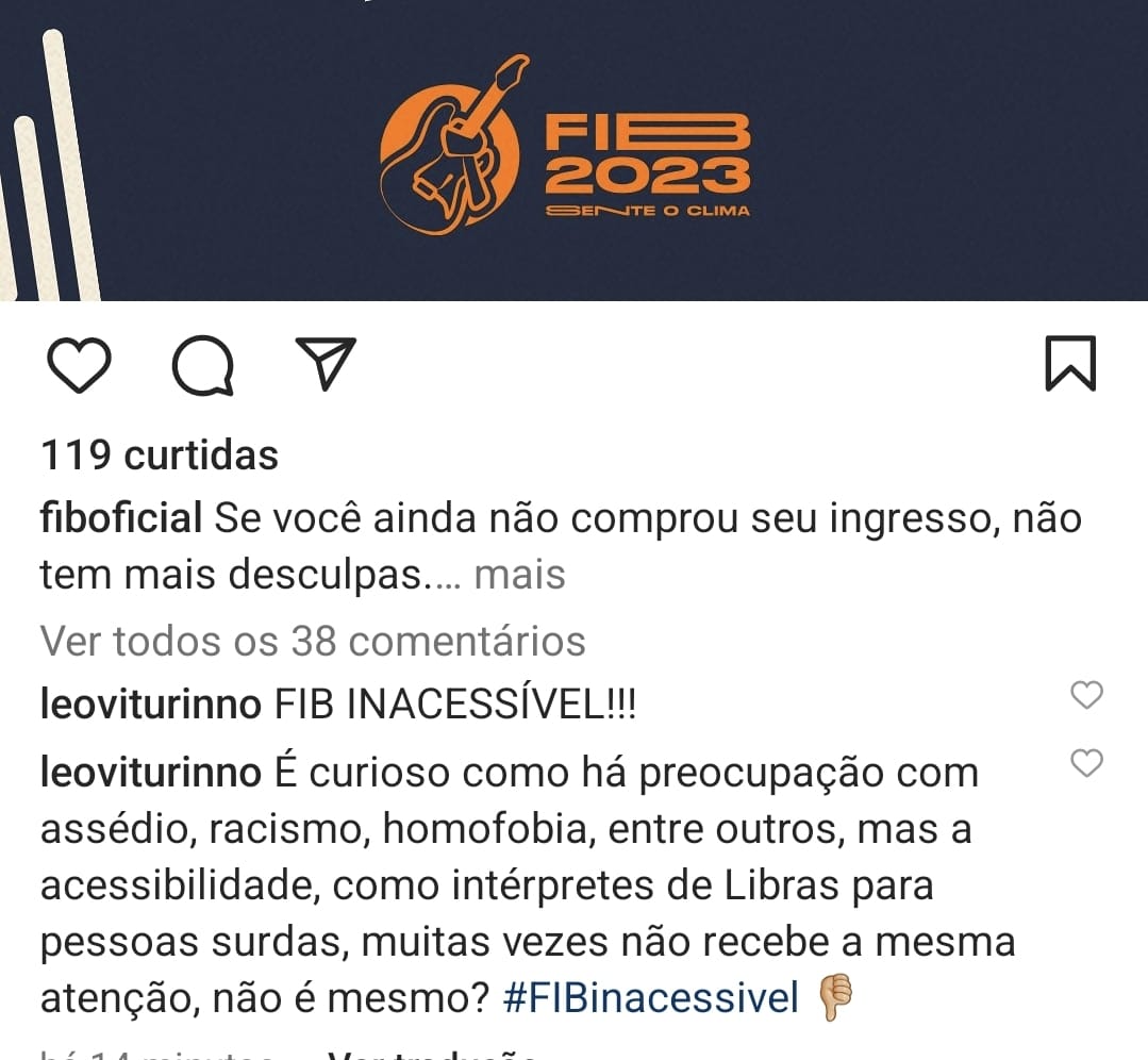 - Léo Viturinno também tem cobrado publicamente por acessibilidade no festival por meio de comentários nas redes sociais do evento. Reprodução / Instagram.