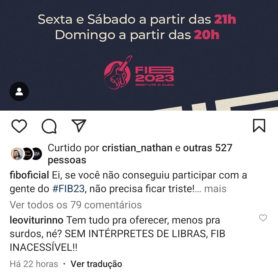 Membros da comunidade surda da Bahia denunciaram ao Ministério Público do Estado a falta de acessibilidade para pessoas com deficiência auditiva no Festival. Além disso, cobram o cumprimento da Lei Brasileira de Inclusão pela empresa responsável pelo evento. 31 de agosto de 2023 Afonso Ribas“Por que nós surdos temos que lutar, cobrar para ter acessibilidade? Por que nós não merecemos esse direito? Nem dignidade?” O questionamento é também um desabafo do influencer digital e professor universitário Léo Viturinno. Juntamente com outros integrantes da comunidade surda baiana, ele denunciou, em ofício encaminhado ao Ministério Público do Estado (MP-BA), a falta de acessibilidade para pessoas com deficiência auditiva no Festival de Inverno Bahia (FIB), que teve início nesta sexta-feira, 25.
