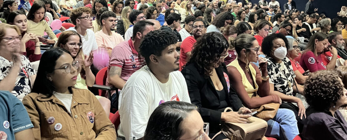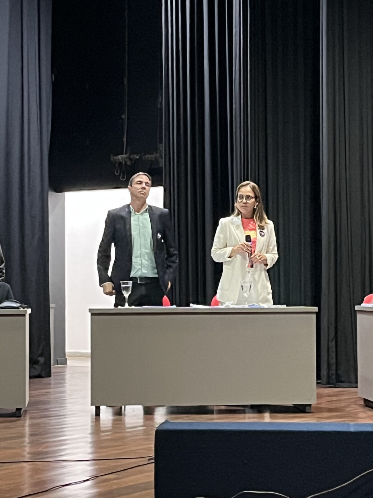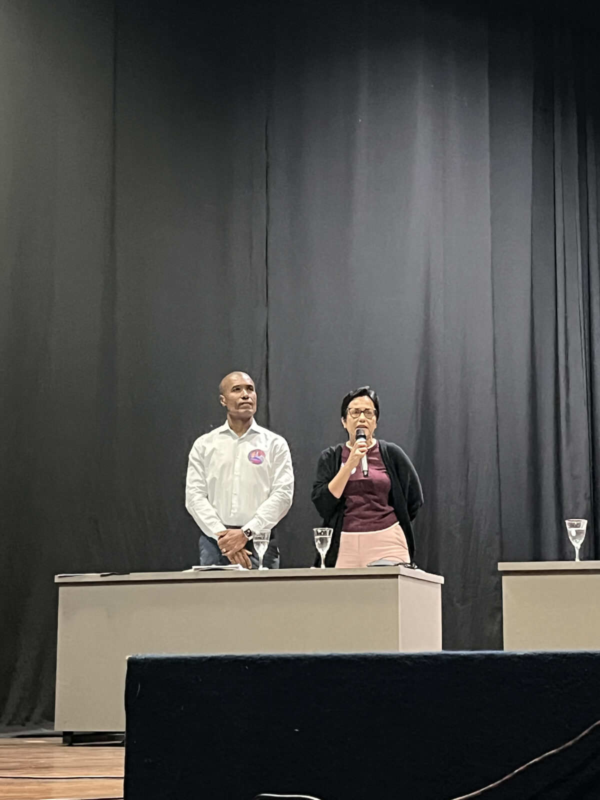 Os representantes da Chapa 2, “Cuidar para Transformar” iniciaram o debate, conforme ordem definida por sorteio. Durante sua fala de apresentação, a professora e candidata à vice-reitora, Francys Cerqueira, criticou a ausência de intérprete de Libras no evento. “Muito me entristece ver um professor dessa universidade, o professor Leandro Viturinno, professor surdo, vir para essa plenária e ficar sem intérprete. Esse é o olhar da universidade que é excludente e que não pensa em acessibilidade para todas as pessoas”, disse.