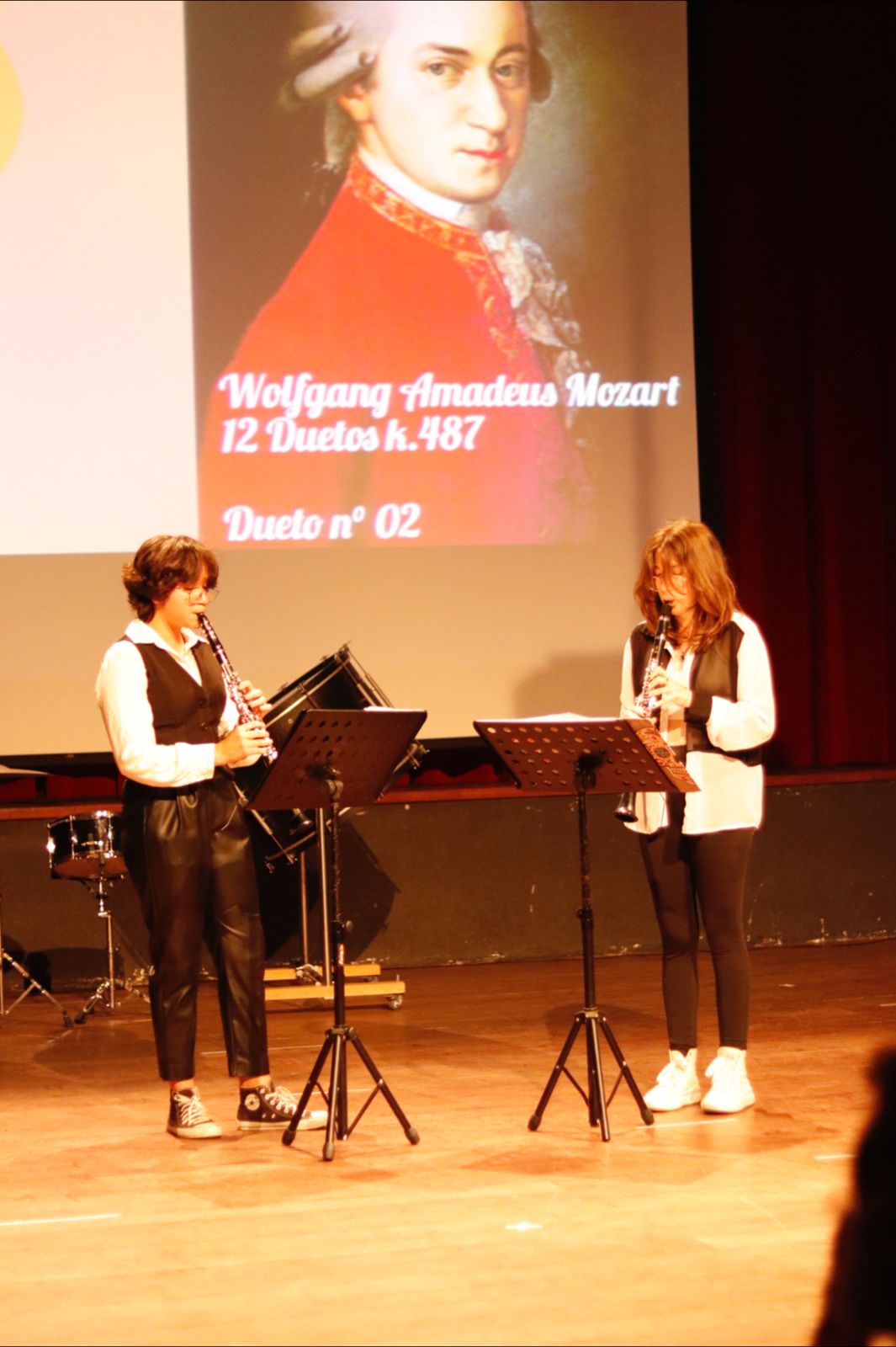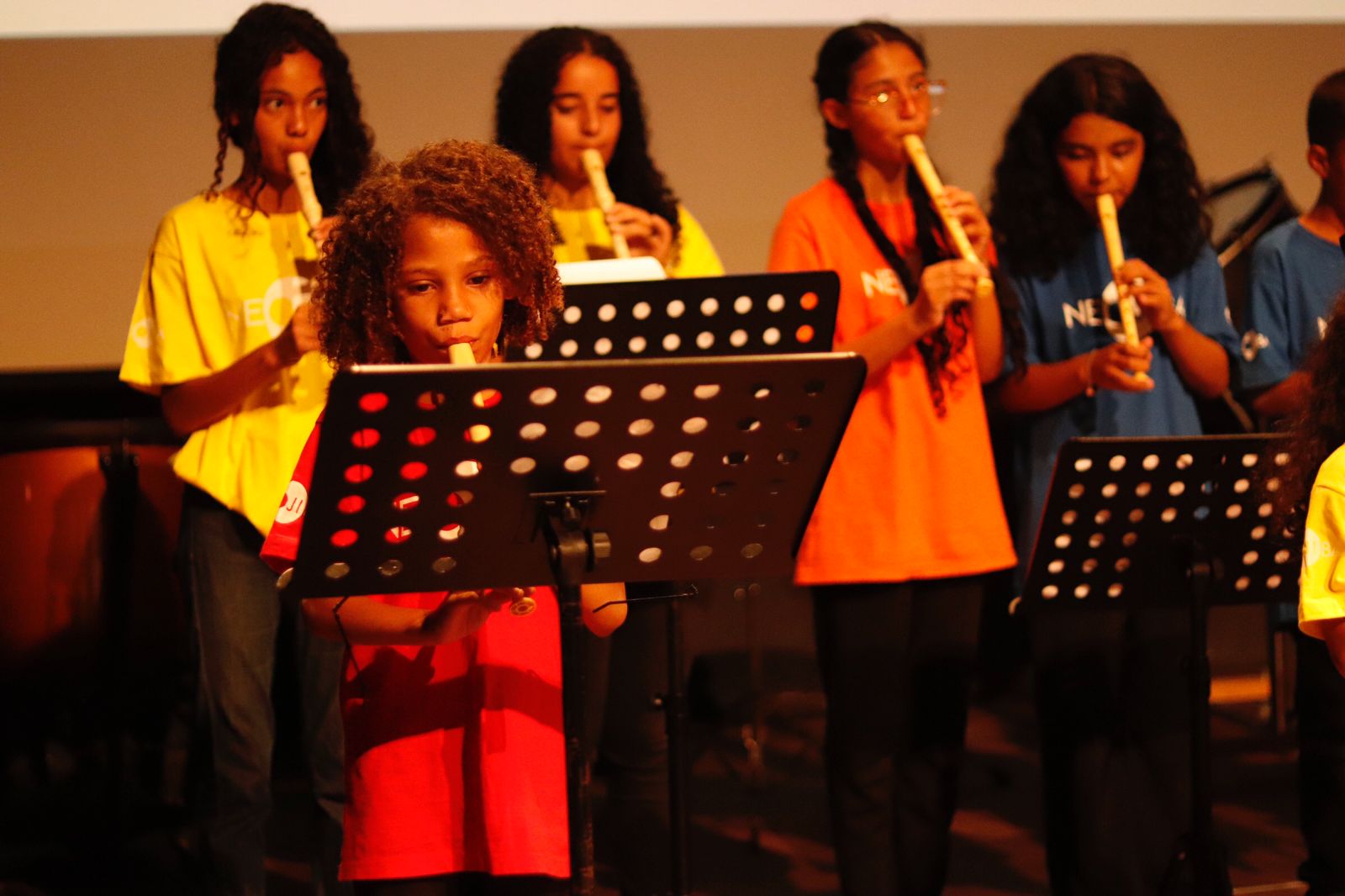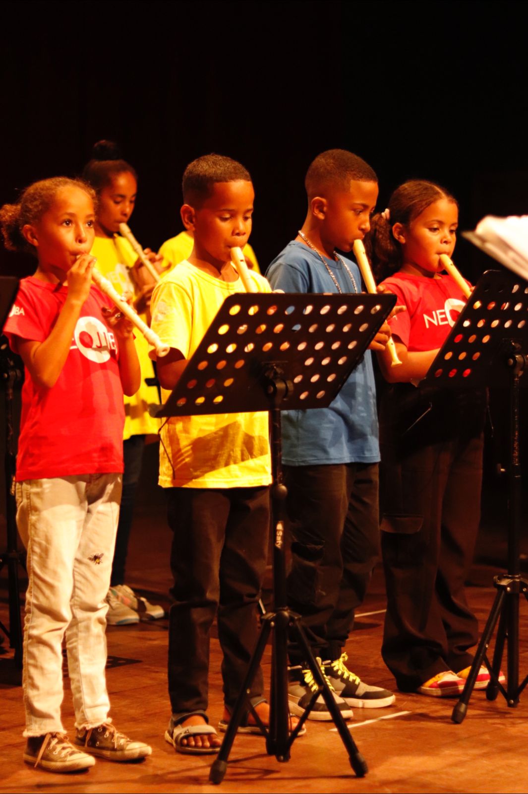 No início das apresentações, os alunos performaram duetos, como o interpretado em clarinetes do compositor Wolfgang Amadeus Mozart e a música La Vie En Rose, de Édith Piaf, em violino e flauta doce. Em seguida, a turma de iniciação em flauta doce fez sua primeira apresentação para o público com a popular Brilha, brilha estrelinha.