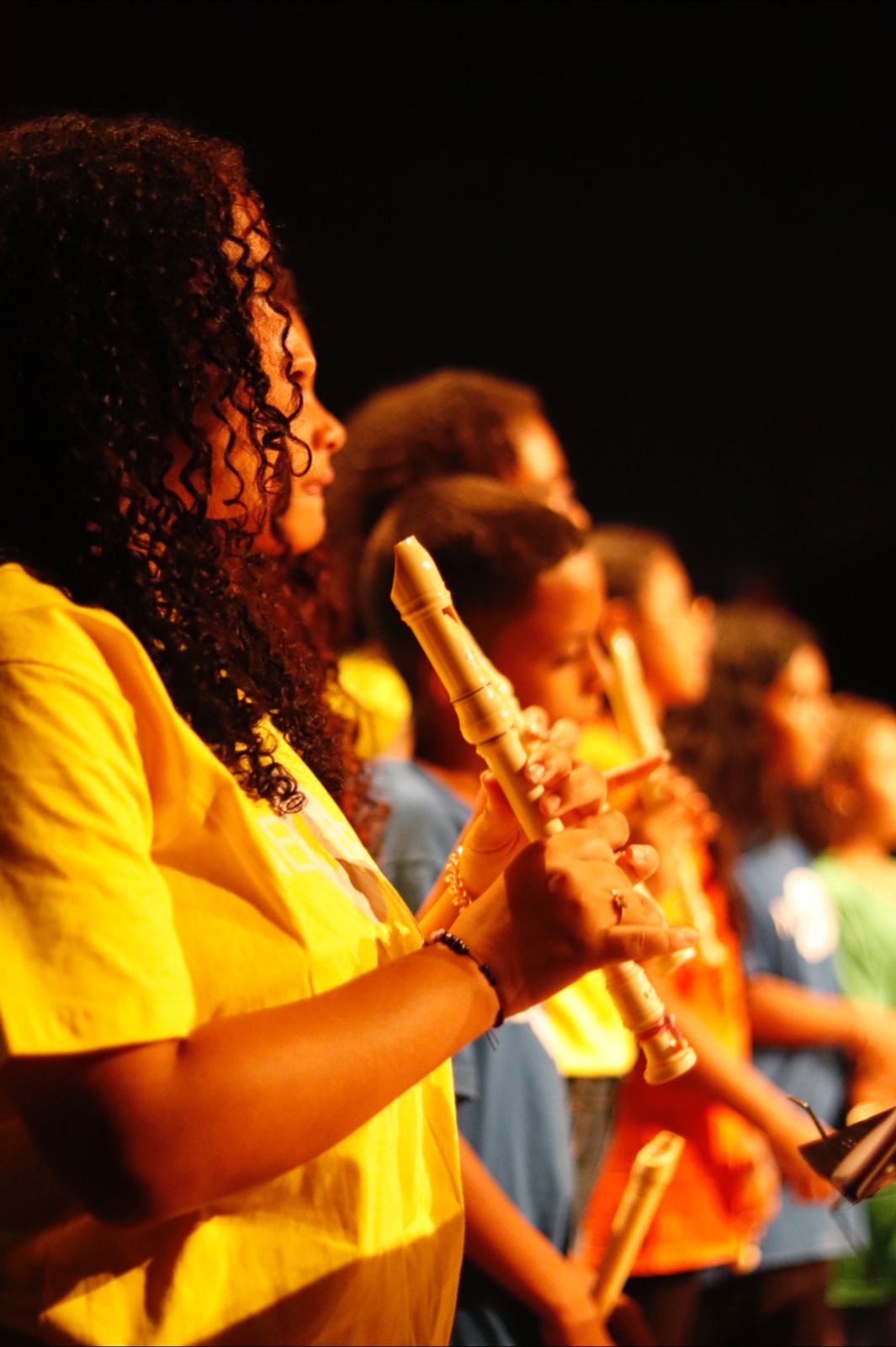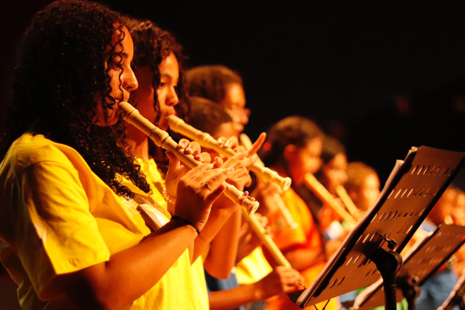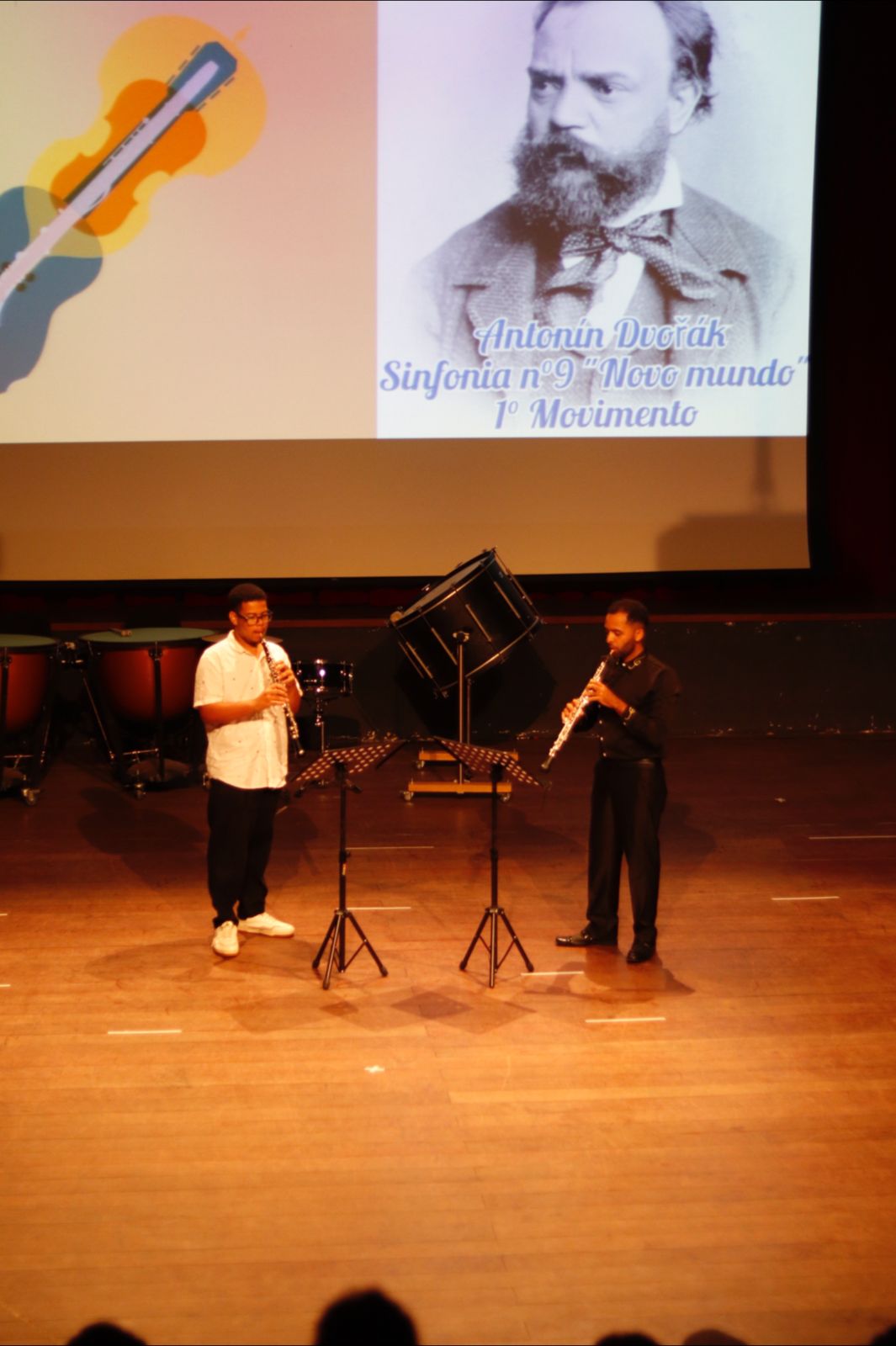 No início das apresentações, os alunos performaram duetos, como o interpretado em clarinetes do compositor Wolfgang Amadeus Mozart e a música La Vie En Rose, de Édith Piaf, em violino e flauta doce. Em seguida, a turma de iniciação em flauta doce fez sua primeira apresentação para o público com a popular Brilha, brilha estrelinha.