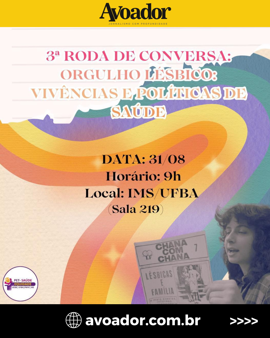 A roda de conversa é uma de dar visibilidade às lutas da comunidade lésbicas e trabalhar para desmantelar estereótipos e garantir igualdade de direitos para todas 29 de agosto de 2024 Da RedaçãoNeste, dia 31 de agosto, acontece a Roda de Conversa: Orgulho Lésbico: Vivências e Políticas de Saúde, às 9h, na sala 219, da Universidade Federal da Bahia (Ufba), em Vitória da Conquista. O evento faz parte do Programa de Educação Tutorial (Pet) Saúde Equidade, desenvolvido pela Uesb e a Ufba, e financiado pelo Ministério da Educação.