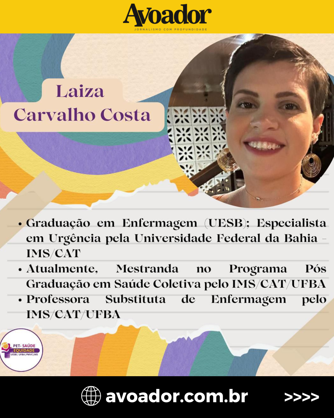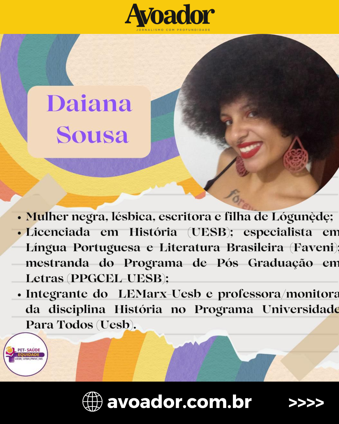 Uesb), professora do Instituto Multidisciplinar em Saúde da Ufba (IMS), Kueyla de Andrade Bitencourt; a escritora, licenciada em História pela Universidade Estadual do Sudoeste da Bahia, Daiana Sousa; a enfermeira e professora adjunta de Enfermagem da Universidade Federal da Bahia( Ufba), Laiza Carvalho Costa. Também participará da conversa a dupla Aléxia e Malu, responsáveis pelo Momento Cultural do evento.