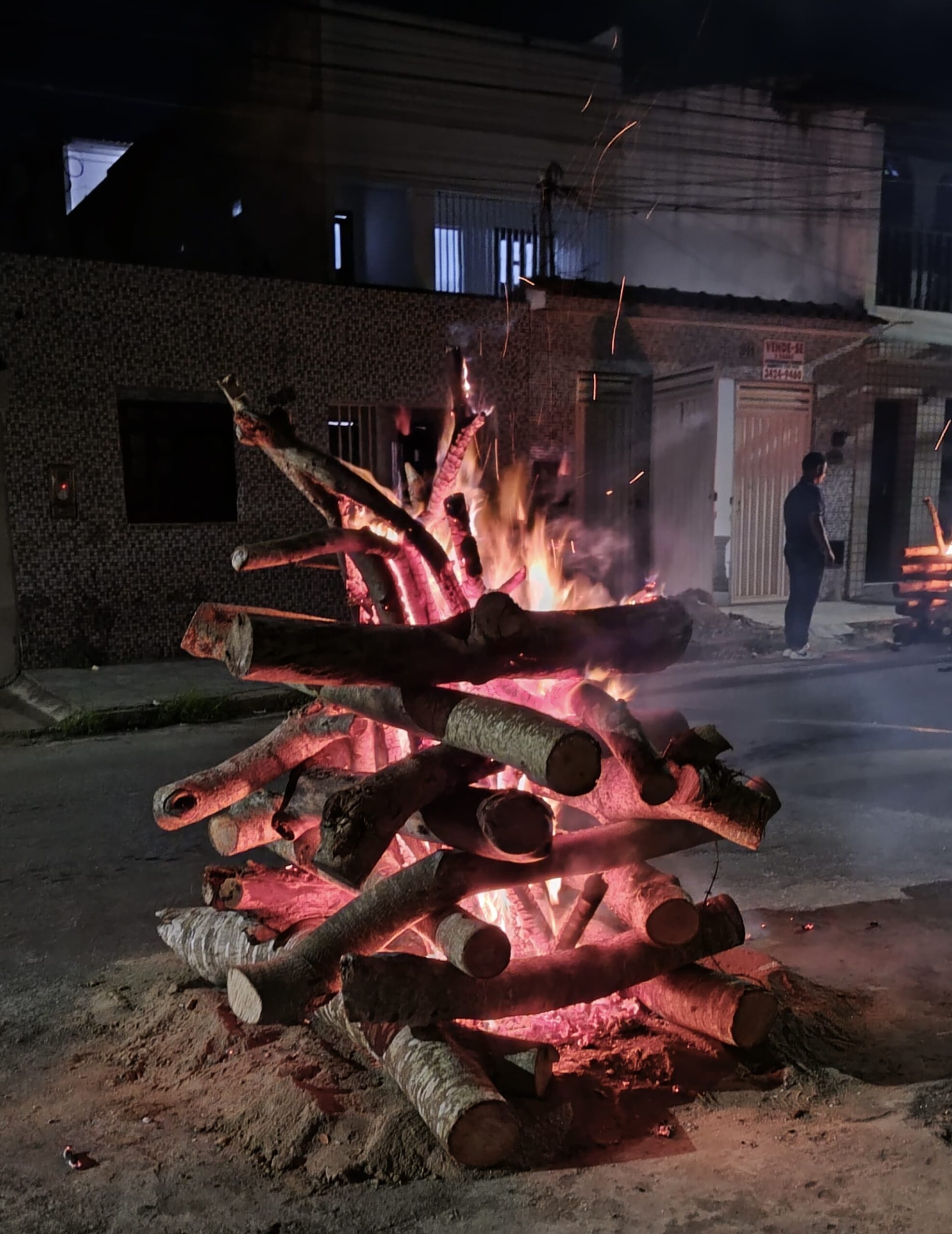 Apesar de ter vindo de terras distantes, essa tradição associada às celebrações do solstício de verão carrega uma mensagem universal de preservar e passar adiante. O comerciante Gidalvo Santos de Azevedo, 57 anos, acende fogueira no bairro Guarani há 20 anos com a esposa e o filho. Todo ano a família se reúne com os amigos do bairro para compartilhar a alegria dos festejos com muita música e comidas típicas. Ele comenta sobre o forte simbolismo que a fogueira em si tem para o nordestino. “O São João em si nos remete à nossa origem né. Eu acho que a fogueira é o maior símbolo da fé do nordestino.”