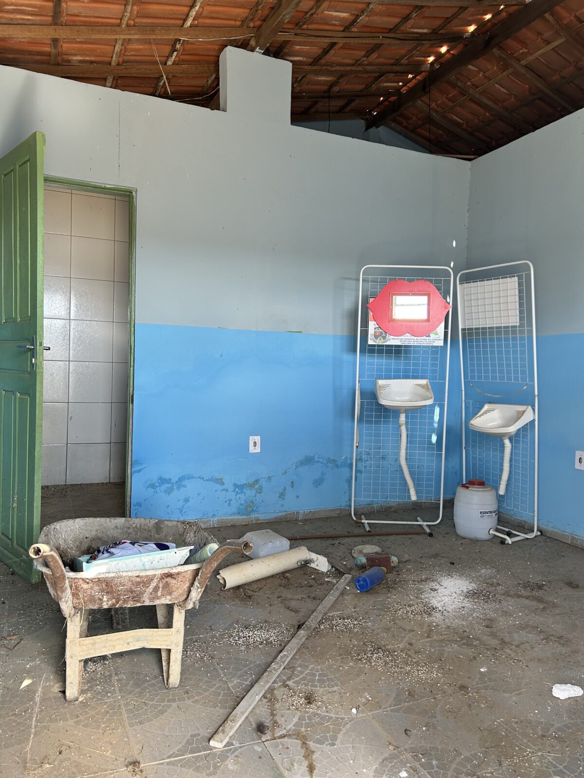 “Foi assim que a comunidade se uniu, fez uma caixa d’água no fundo e ligou a água. Passaram-se cerca de quatro anos, o prédio foi se deteriorando porque fica muito úmido quando chove. As paredes ficaram inchadas, e o espaço foi invadido por pardais. A gente pediu forro e material para fechar as paredes, mas não entregaram”, afirma Valdenicio.