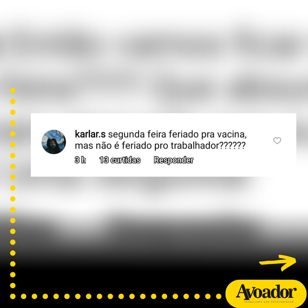 “segunda feira feriado pra vacina, mas não é feriado pro trabalhador??????”, disse outra internauta.