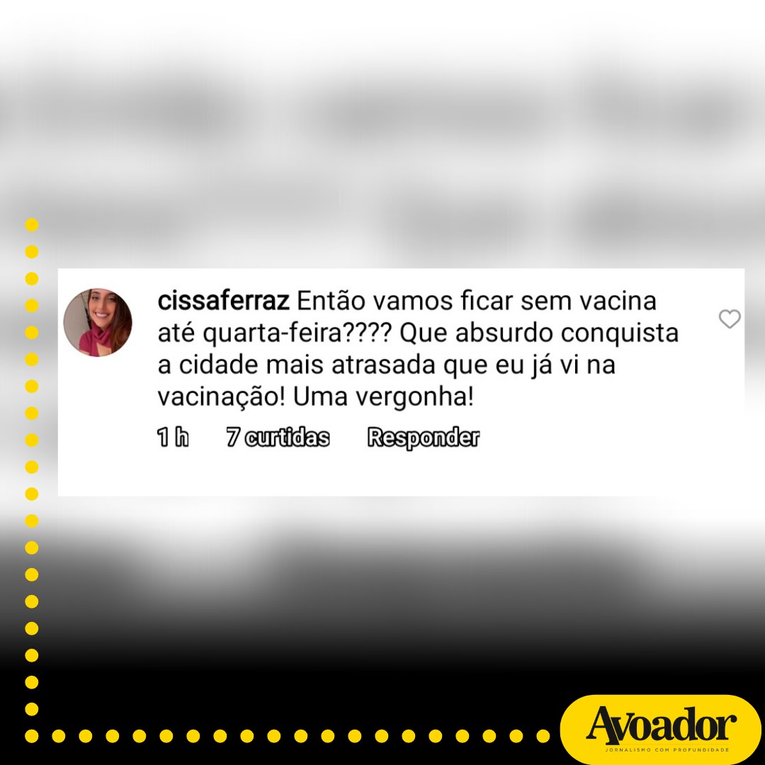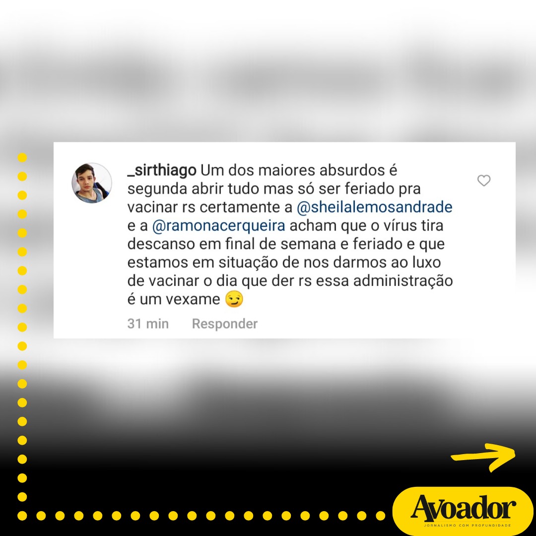 “Um dos maiores absurdos é segunda abrir tudo mas só ser feriado pra vacinar rs certamente a @sheilalemosandrade e a @ramonacerqueira acham que o vírus tira descanso em final de semana e feriado e que estamos em situação de nos darmos ao luxo de vacinar o dia que der rs essa administração é um vexame”, comentou um internauta marcando a prefeita Sheila Lemos.