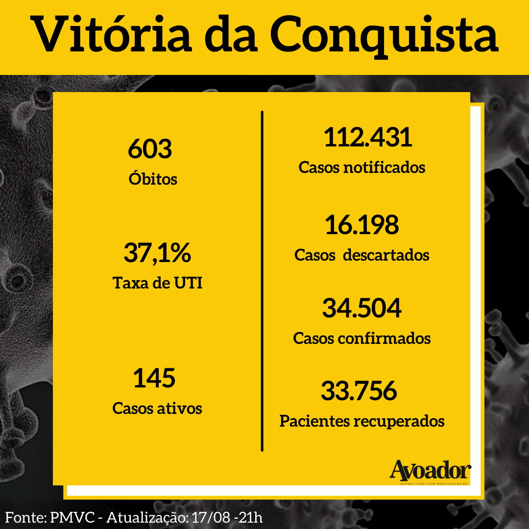O Boletim Epidemiológico Municipal também informou que Conquista contabiliza 34.504 casos de infecção da doença, desde o dia 31 de março de 2020, quando foi notificado o primeiro caso. Até o momento, 33.756 pessoas já estão recuperadas e outras 145 continuam com o vírus ativado.