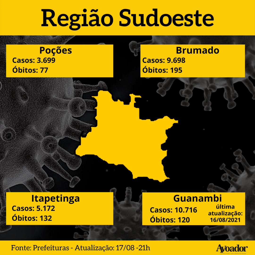 A segunda morte é de uma pessoa do sexo feminino, com 80 anos. Ela morava no bairro Cidade Maravilhosa e deu entrada no Hospital Geral de Vitória da Conquista (HGVC) no dia 4 de julho. Morreu no último domingo (15). A terceira morte registrada hoje é do morador do bairro Brasil, de 78 anos. O homem, que faleceu nesta terça, estava em tratamento no Hospital Samur desde o dia 26 de julho, onde faleceu.