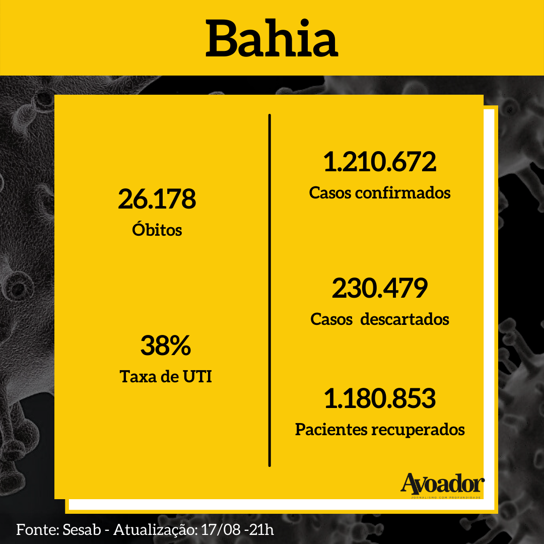 Confira a atualização dos números da covid-19 desta terça-feira, 17 de agosto de 2021 17 de agosto de 2021 Gabriela SouzaNesta terça-feira (17/08), três mortes em decorrência da covid-19 foram registradas em Vitória da Conquista. Com mais essas vidas perdidas, o município chega a marca de 603 óbitos.
