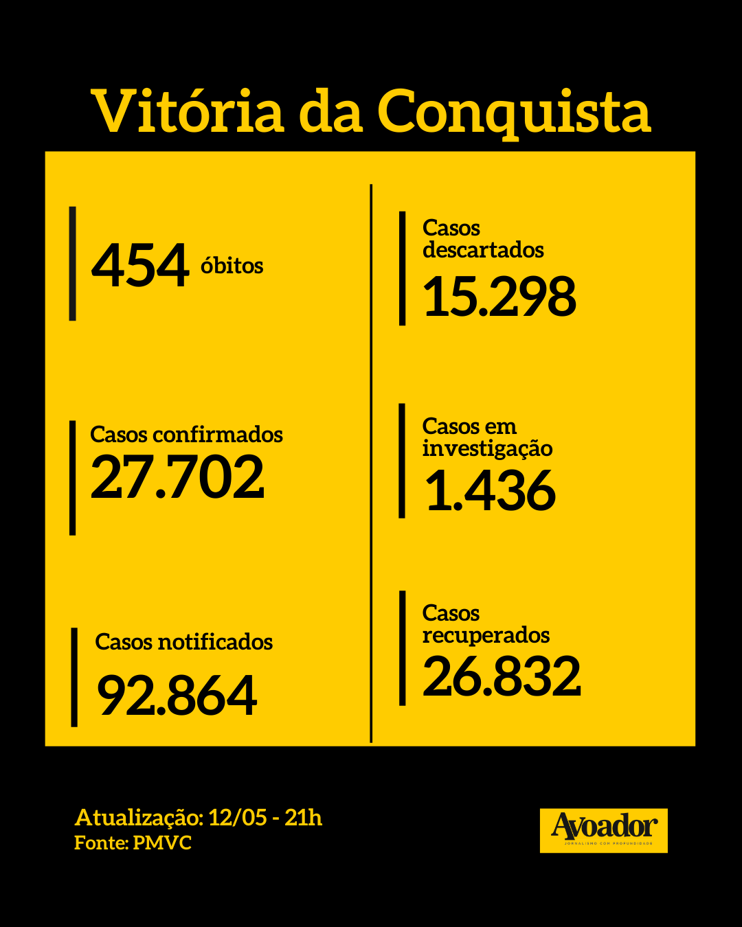 Confira abaixo os dados de Vitória da Conquista, da Bahia, do Brasil e do mundo.
