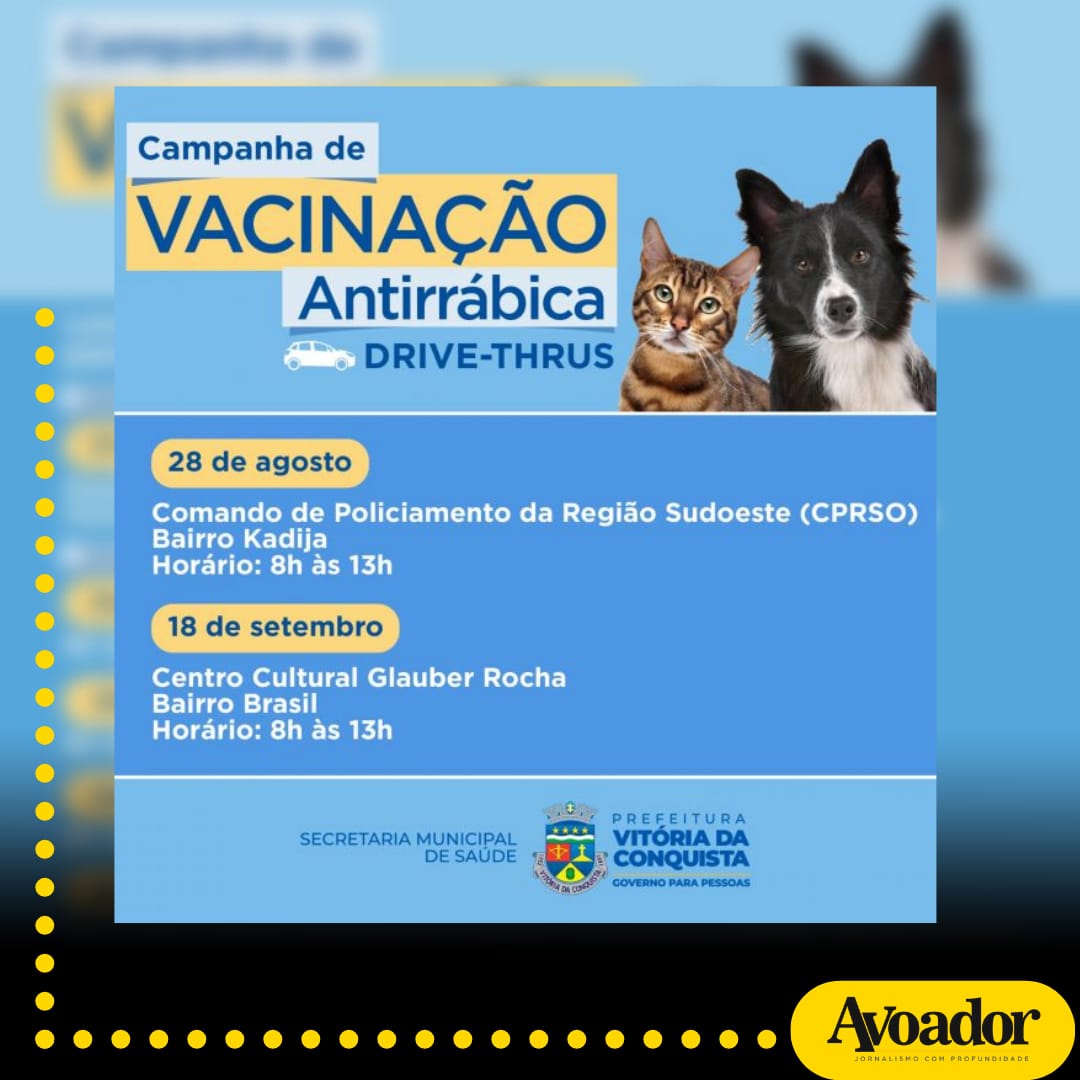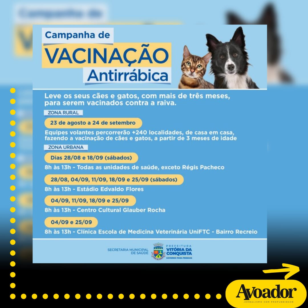 A vacina antirrábica é a maneira mais eficaz de controle e prevenção da raiva em animais. A aplicação em dose é única pelo Sistema Único de Saúde (SUS) 27 de agosto de 2021 Mikhaelle PiagioNeste sábado (28/08), terá início na cidade de Vitória da Conquista a campanha anual de vacinação contra a raiva em cães e gatos a partir de três meses de idade. Serão cinco sábados, no período de 28 de agosto a 25 de setembro, com atendimento das 8h às 13h.
