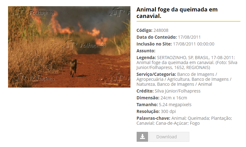 Já a imagem de um animal correndo em meio às chamas foi feita durante queimada em um canavial em Sertãozinho, no interior de São Paulo A foto foi tirada em 17 de agosto de 2011 e cadastrada no site FolhaPress, agência de notícias que reúne possui um banco de imagens online produzidas por fotojornalista no Brasil. O site pertence ao Grupo Folha.