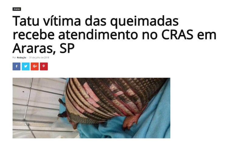 Já o tatu, que foi resgatado das chamas, foi encontrado em um canavial em Araras, à margem da Rodovia Anhaguera (SP-330) em um incêndio que devastou a região em 30 de julho de 2018. O animal foi encontrado pela equipe de monitoramento da Usina São João e levado para o Centro de Recuperação de Animais Silvestre de Araras. Numa busca na rede, encontramos informações sobre o incêndio no canavial sites locais. Já a foto do animal é localizada no site “Repórter Beto Ribeiro” em tratamento no centro em 31 de julho de 2018. O tatu, que teve 70% do corpo queimado, morreu dias depois.
