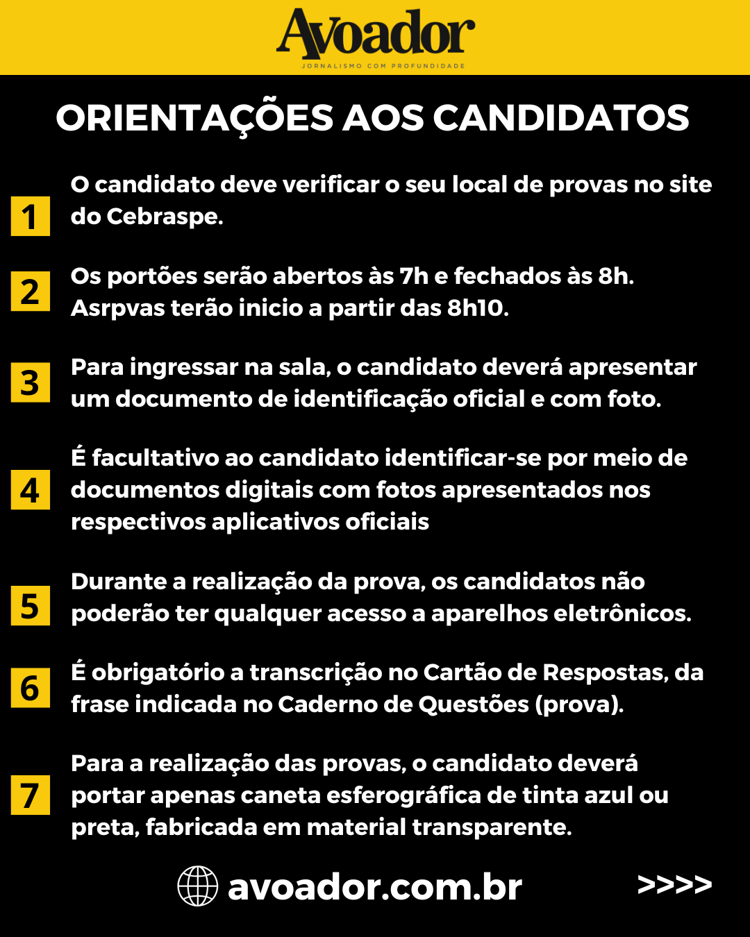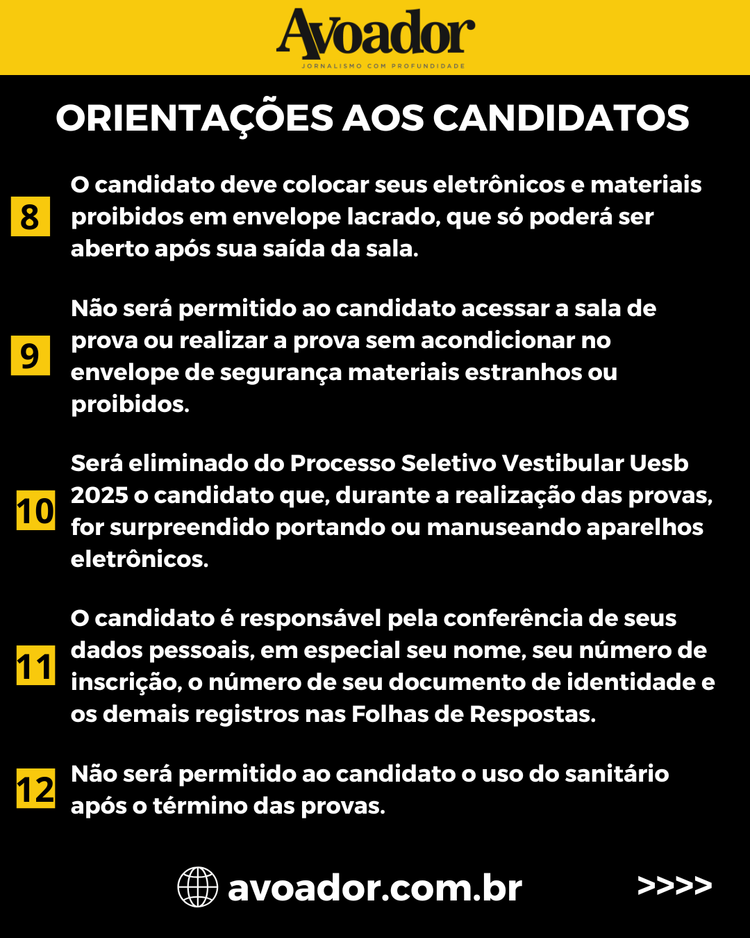 Os portões estarão abertos das 7h às 8h e as provas terão início a partir das 8h10 26 de novembro de 2024 Arthur VitorNos dias 1° e 2 de dezembro, domingo e segunda-feira, em etapa única, serão realizadas as provas do Processo Seletivo Vestibular 2025 da Universidade Estadual do Sudoeste da Bahia (Uesb), em Itapetinga, Jequié e Vitória da Conquista. Serão 10.926 candidatos concorrendo a 1.008 vagas , em 47 cursos de graduação distribuídos entre as três cidades.