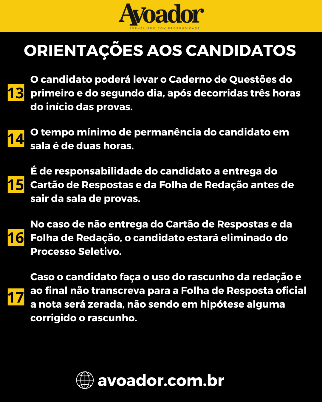 O estudante conquistense, Marcos dos Santos, 19 anos, vai realizar o vestibular para os cursos das licenciaturas de Geografia, como primeira opção, e Pedagogia, como segunda. “Sou muito apaixonado pelas licenciaturas e escolhi ser professor com muito orgulho”, pontuou. No dia da prova, ele irá usar a estratégia de responder 10 questões e descansar por sete minutos, e focar da matéria mais fácil para a mais difícil. “Gosto de começar sempre por português e termino sempre com a redação que toma mais tempo”, finalizou.