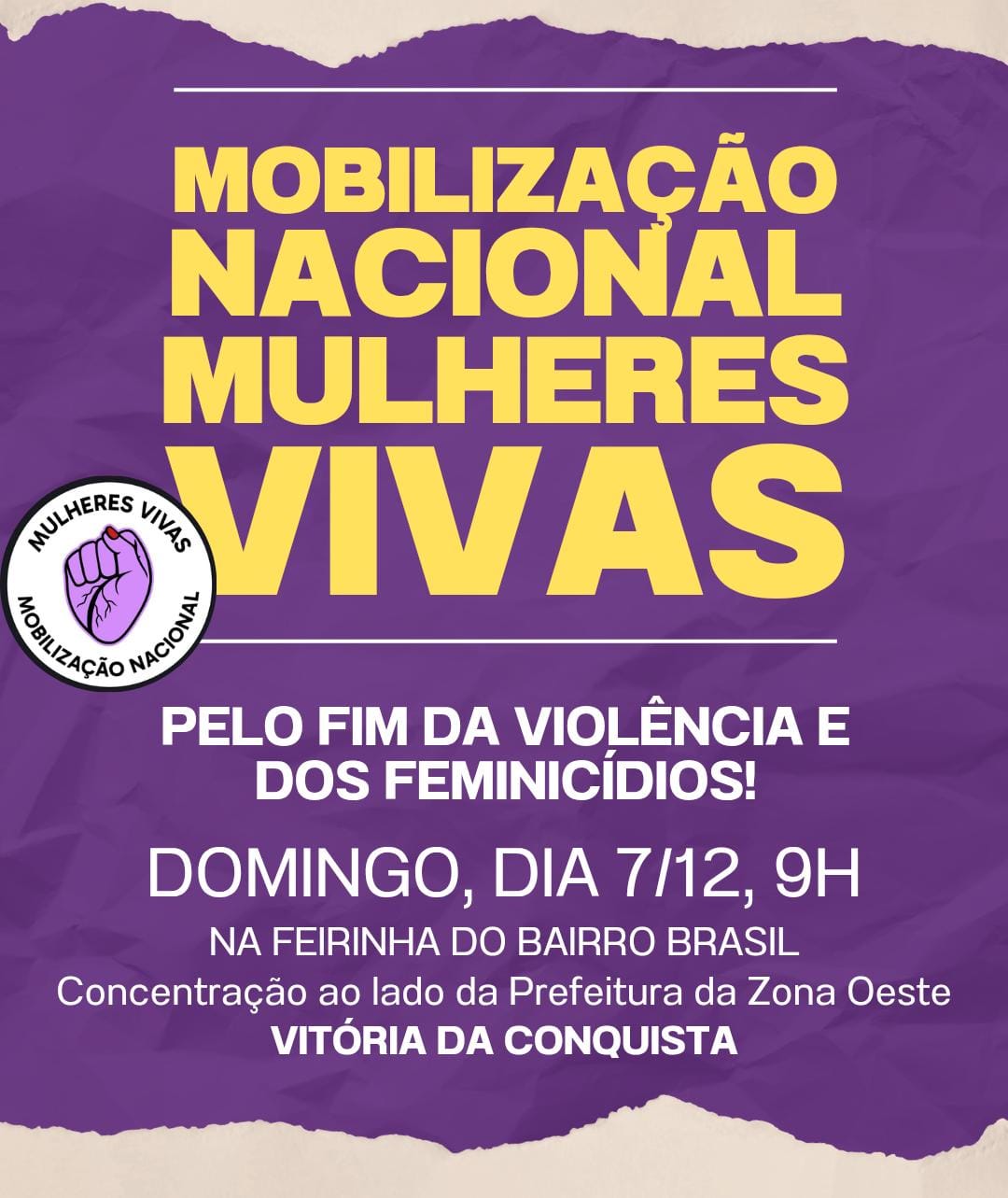 Ato “Mulheres Vivas” reúne população na feira do bairro Brasil a partir das 9h. O protesto é uma resposta ao aumento da violência de gênero no país 5 de dezembro de 2025 Maria Eduarda Leite/Conquista Repórter*Neste domingo, 7, a população de Vitória da Conquista irá se juntar ao movimento nacional Levante Mulheres Vivas ao realizar um ato contra o feminicídio e o aumento da violência de gênero no país. A mobilização está marcada para 9h, na feira do bairro Brasil, com concentração ao lado da Prefeitura da Zona Oeste, situada no Centro Cultural Glauber Rocha, na Avenida Brumado.