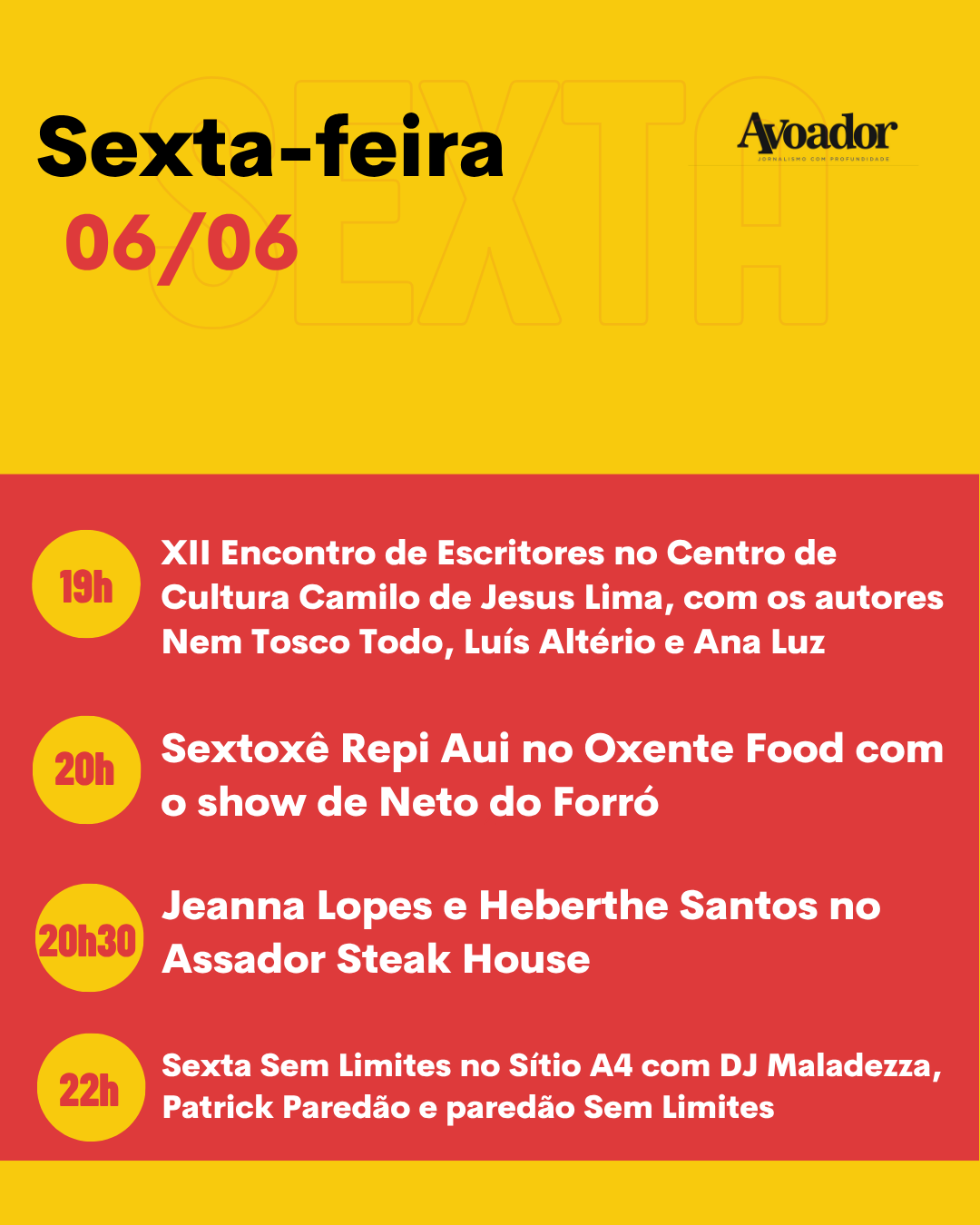 Na sexta-feira (06/06), às 19h, o Centro de Cultura Camilo de Jesus Lima recebe os autores Nem Tosco Todo, Luíz Altério e Ana Luz para um bate-papo sobre criação e escrita literária no XIII Encontro de Escritores. Às 20h, acontece o show Sextoxê Repi Aui, no Oxente Food, com apresentação de Neto do Forró. A partir das 20h30, o Assador Steak House terá música ao vivo com Jeanna Lopes e Heberthe Santos. Às 22h, o Sítio A4 promove a Sexta Sem Limites, com apresentações de DJ Maladezza, Patrick Paredão e o Paredão Sem Limites.