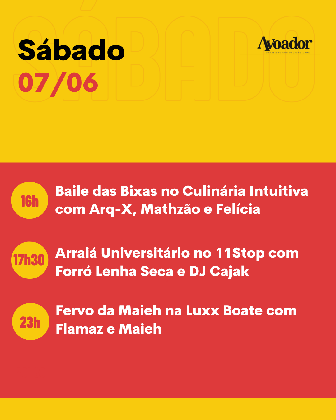 No sábado (07/06), a partir das 16h, é a vez da atração Rolê das Bixas no espaço Culinária Intuitiva, com Arq-X, Mathzão e Felícia. Às 17h30, as atléticas de Jornalismo (Uesb), Direito (Uesb) e Medicina (UFBA) promovem o Arraiá Universitário, com apresentação do grupo Forró Lenha Seca e DJ Cajak no 11Stop. Às 23h, a Luxx Boate realiza o evento Fervo da Maieh, com apresentações de Flamaz e Maieh.