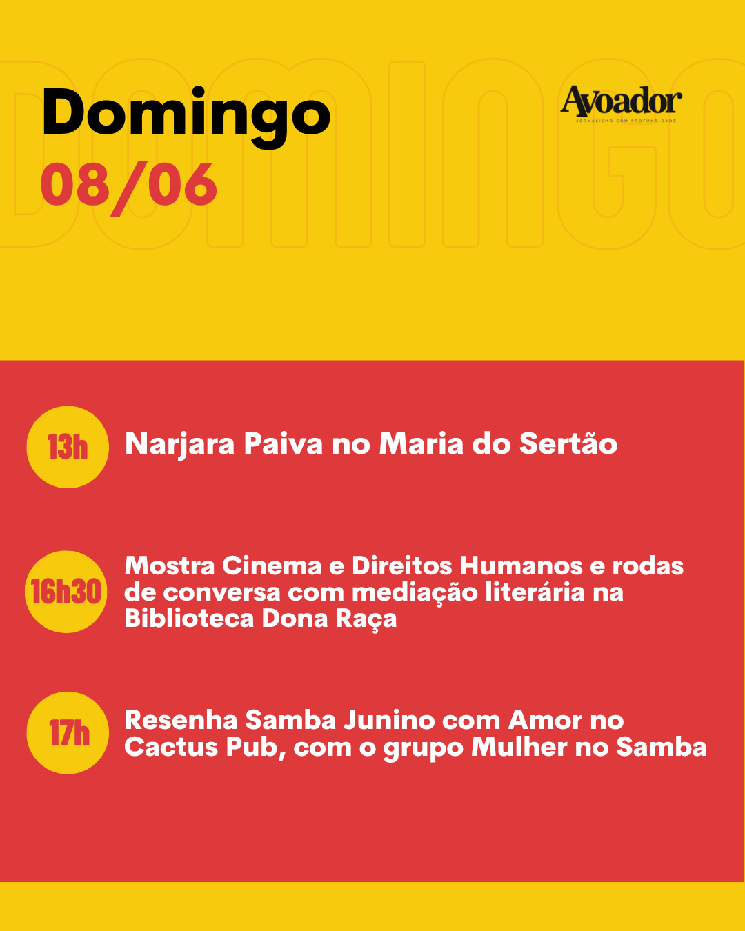 No domingo (08/06), às 13h, o restaurante Maria do Sertão realiza almoço com show de Narjara Paiva. Às 16h30, a Biblioteca Dona Raça sedia a 14ª Mostra de Cinema e Direitos Humanos, com exibição dos curtas Água Rasa, Belos Carnavais e Sobre Amizades e Bicicletas, seguida de Roda de Conversa sobre literatura. Às 17h, no Cactus Pub, acontece a Resenha Samba Junino com Amor, com apresentação do grupo Mulher no Samba.